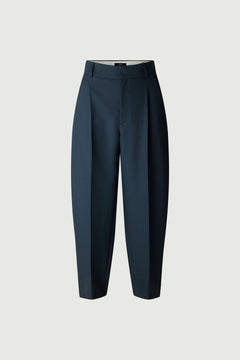 EVA, blouse asymétrique en toile de laine pétrole, offre une coupe ample et un col ouvert. Bas de corps à deux panneaux, manches ourlées. Coupe architecturale et col bateau ajustable pour une allure sophistiquée.